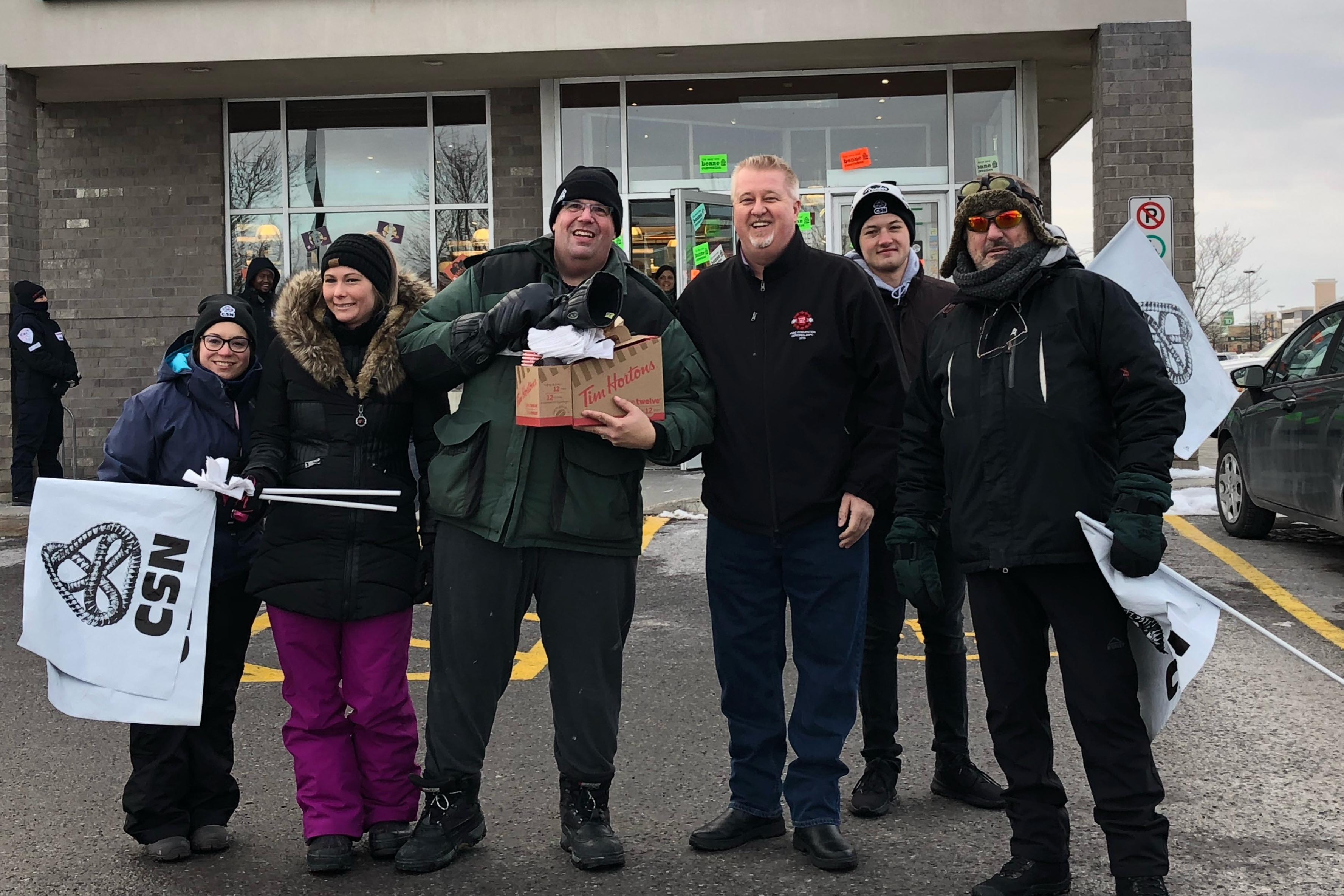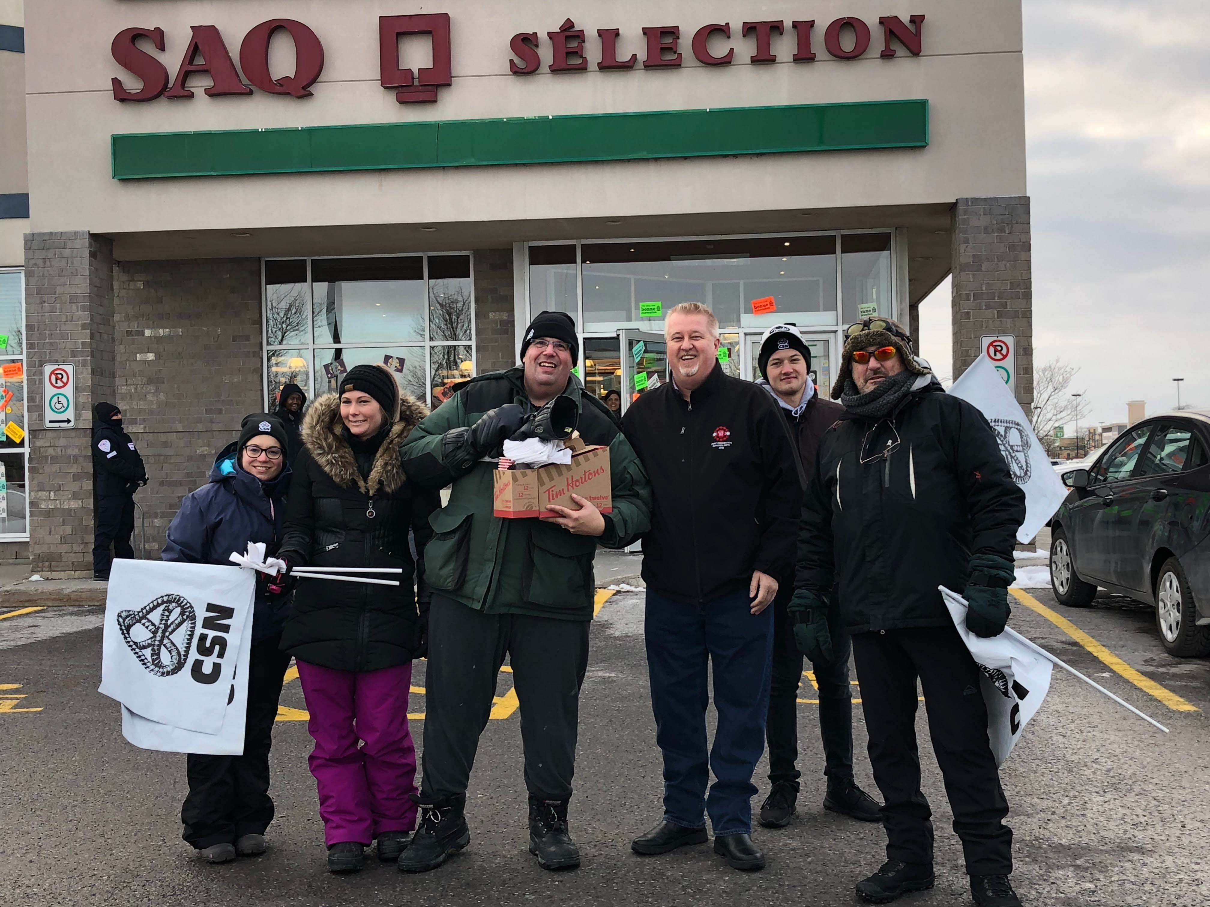 SAQ workers were on strike this weekend everywhere in Quebec in order to force their employer to come back to the bargaining table. These people deserve to be supported. UTE National President Marc Brière delivered coffee and donuts to the strikers this afternoon. Solidarity!
