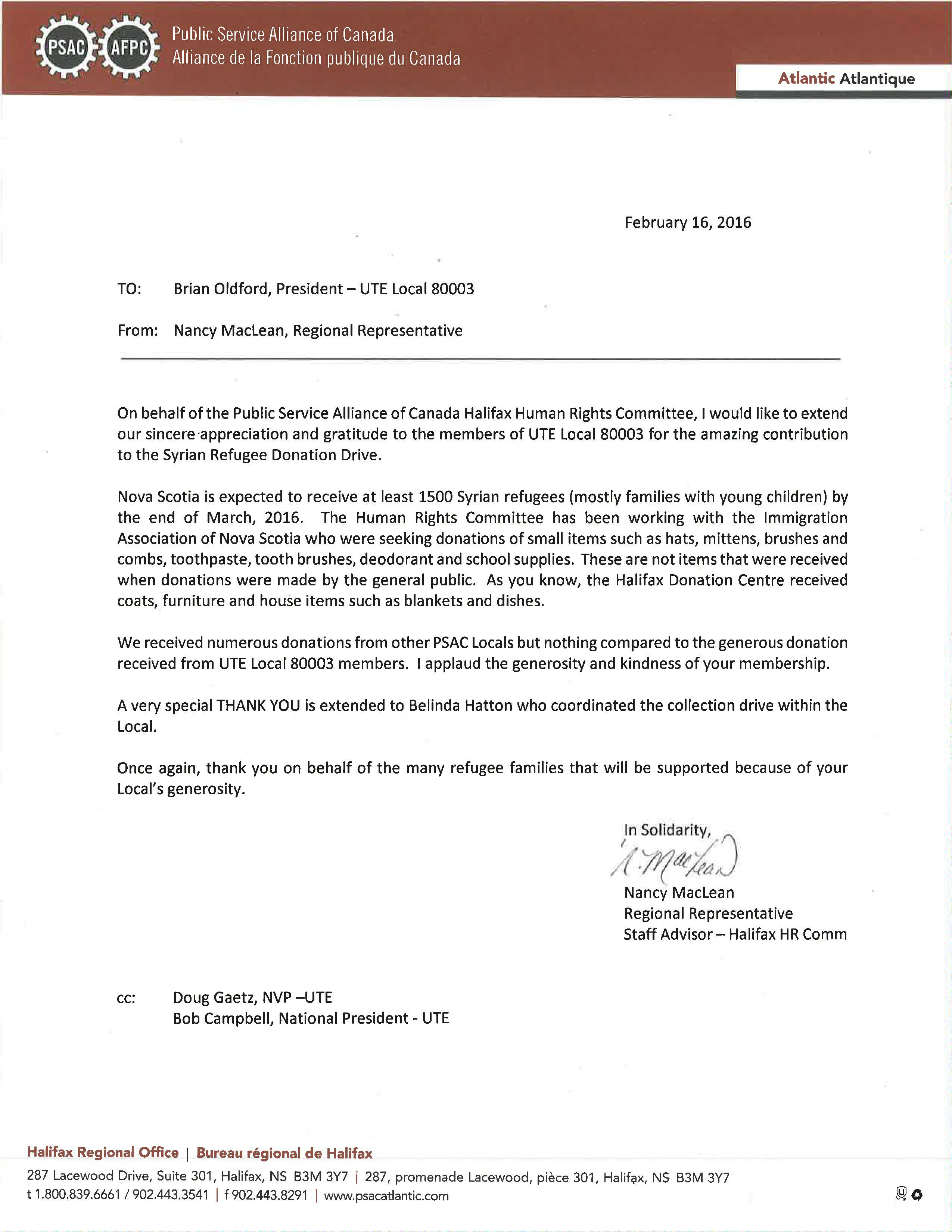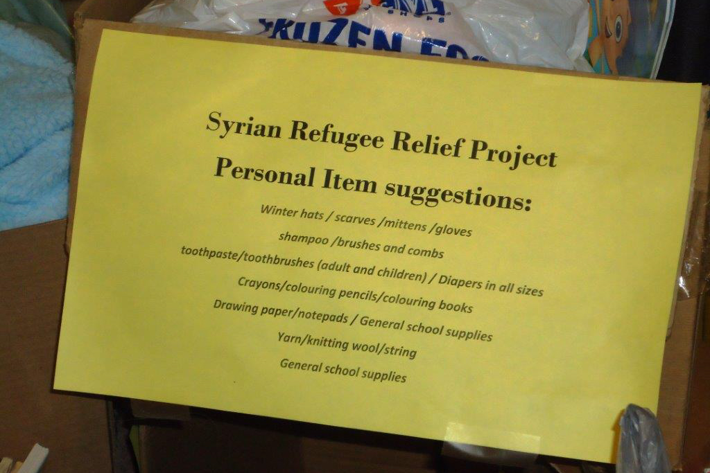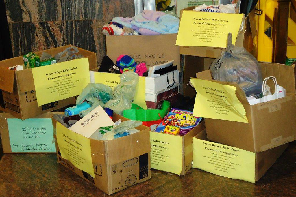 Nova Scotia is expected to receive at least 1500 Syrian refugees, (mostly families with young children) by the end of March 2016. The PSAC Halifax Human Rights Committee has been working with the Immigration Association of Nova Scotia who were seeking donations of small items such as hats, mittens, brushes and combs, toothpaste, tooth brushes, deodorant and school supplies. These were not items that were received when donations were made by the general public. Donations were made by other PSAC locals, but nothing compared to the generous donation received from UTE Local 80003 members.