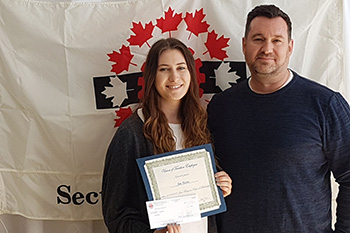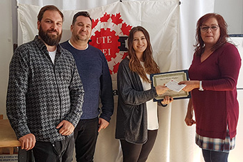 Julia Escobar a remporté la bourse régionale Jean Bergeron de Montréal. Céline Germain, présidente de la section locale 10008 - Montréal, a présenté le chèque et certificat. Dominic Escobar, père de Julia et Anaël Haché, vice-président de la section locale étaient sur place pour la présentation.