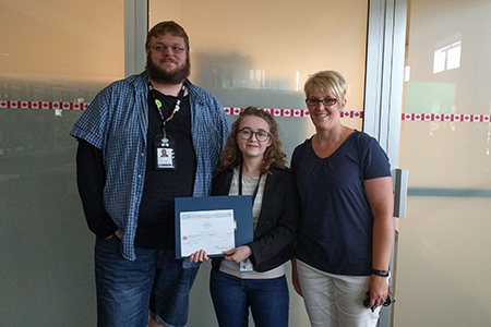 Helen Czapor a remporté la bourse régionale du nord et de l'est de l’Ontario. Chris Heywood, président de la section locale du CF Sudbury - 00042 et Tracy Marcotte, 1ière VP, ont présenté le chèque et certificat.